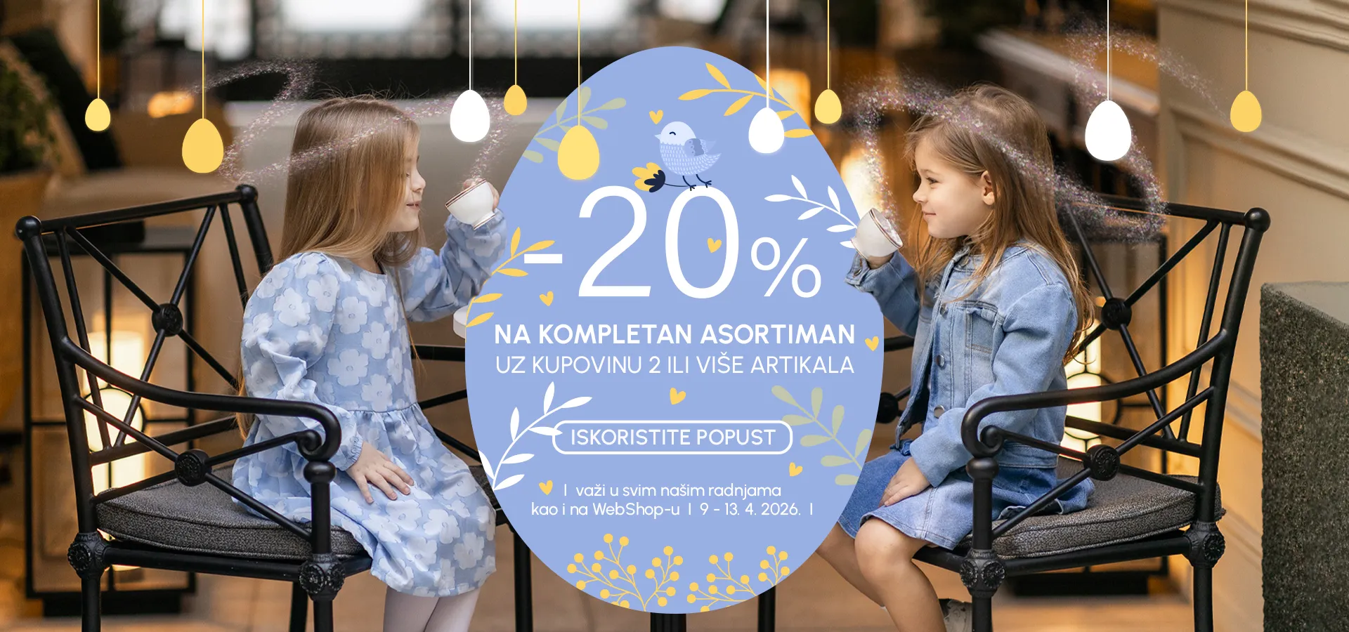 Iskoristite -20% na cjelokupan asortiman proljeće/ljeto uz kupovinu 2 ili više artikala i obogatite garderobu omiljenim komadima za djevojčice i dječake. ♦ Popusti ne važe za već snižene artikle. Popusti se obračunavaju u korpi.